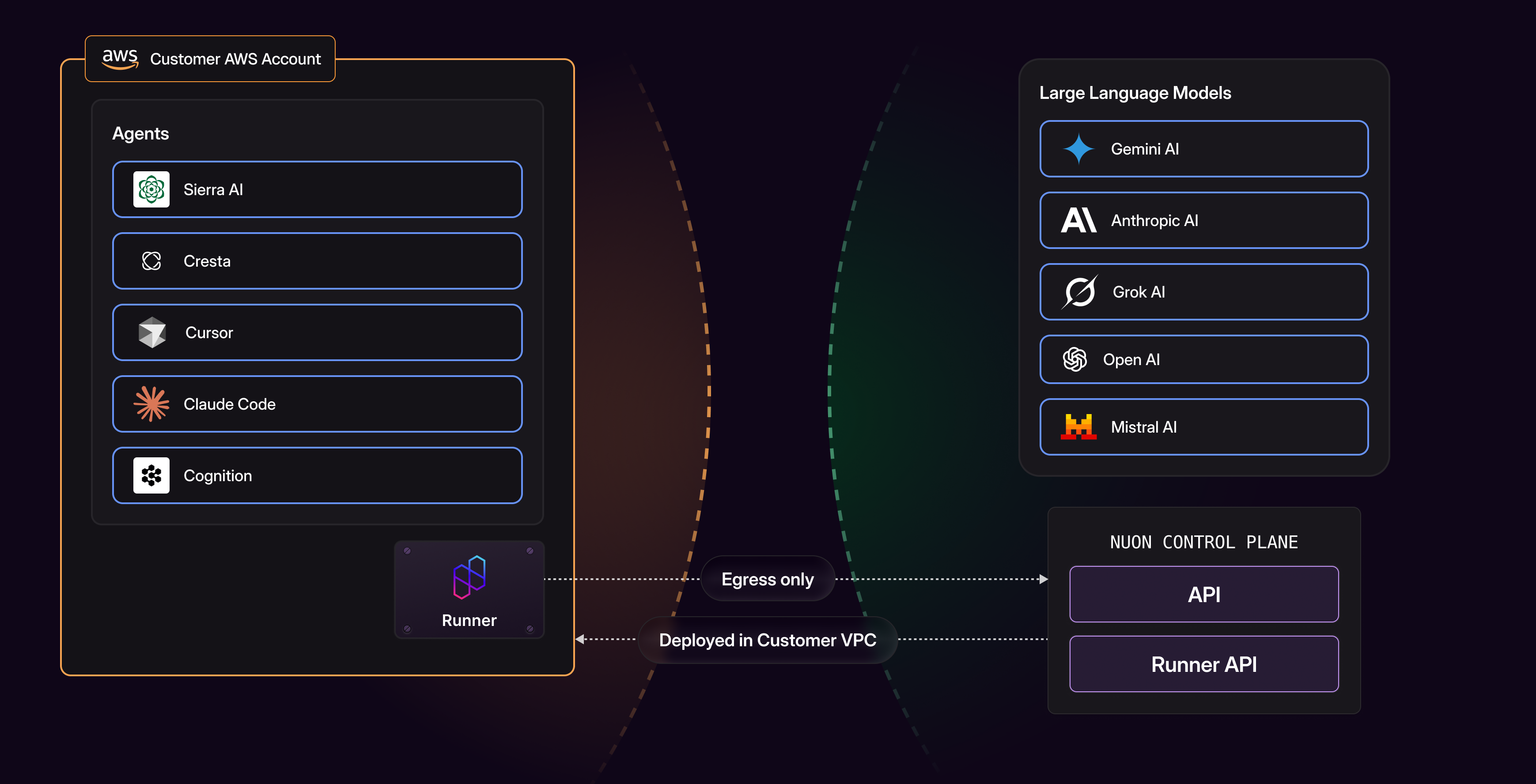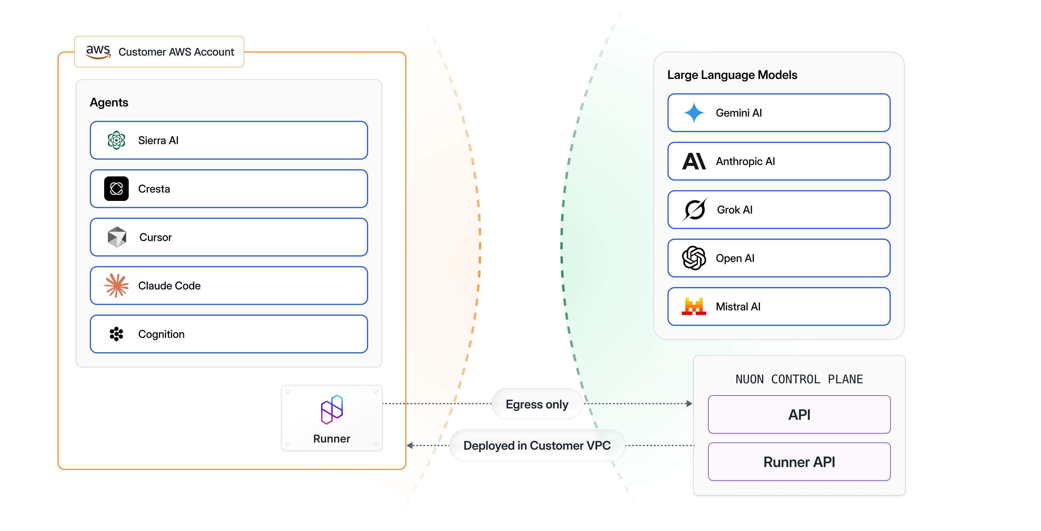 Run autonomous AI agents securely inside customer infrastructure. Host the orchestration layer that decides actions, manages workflow state, and executes tools—while LLM calls remain external.