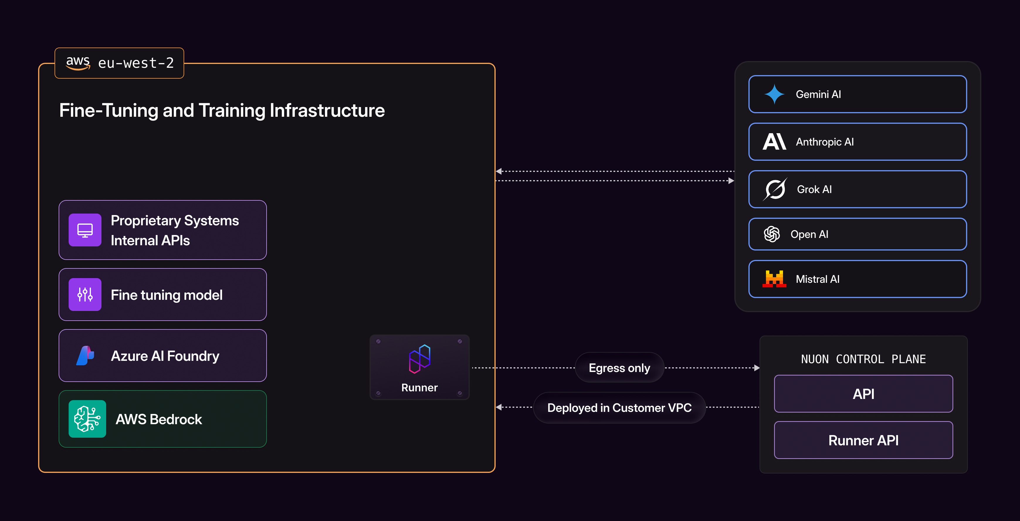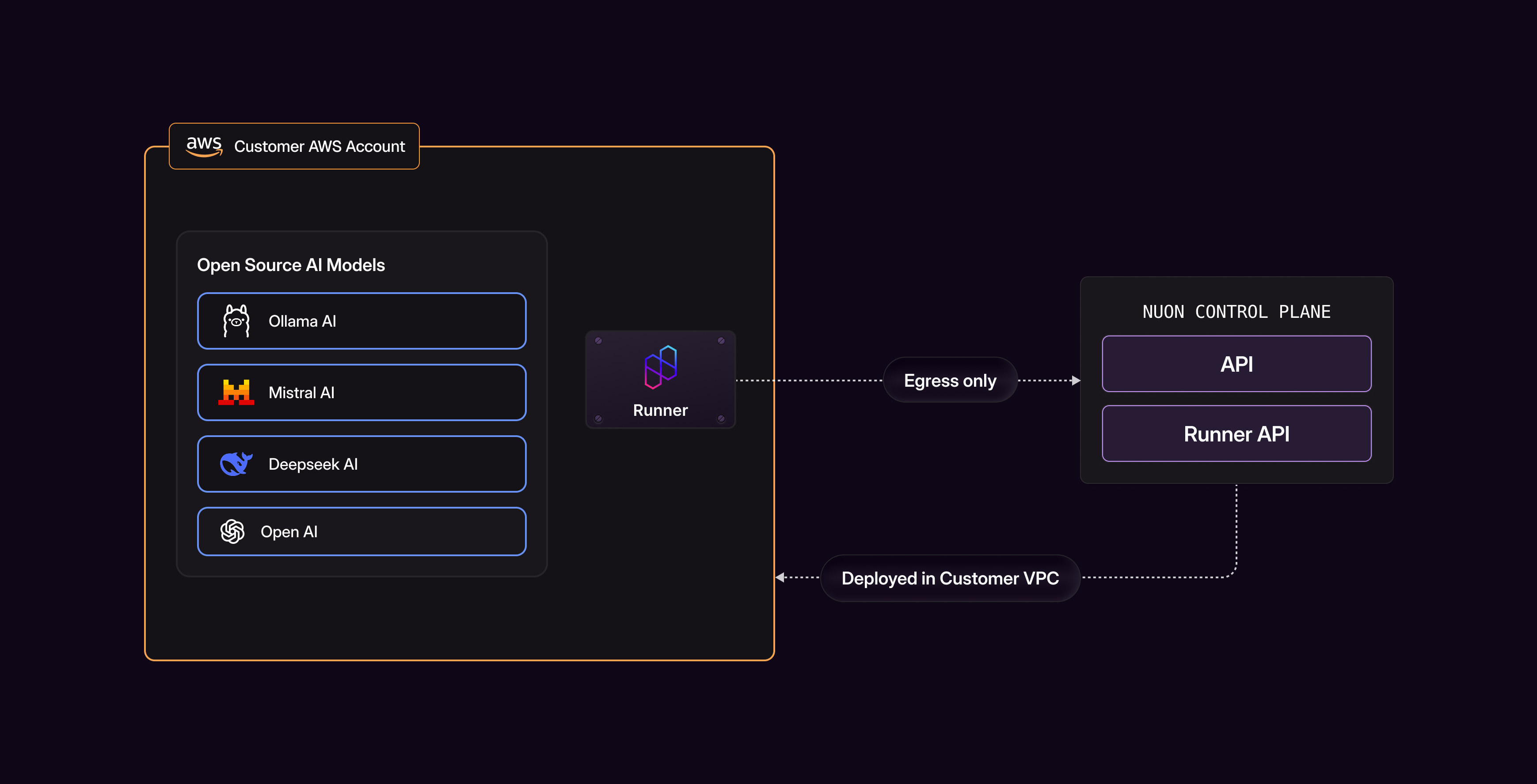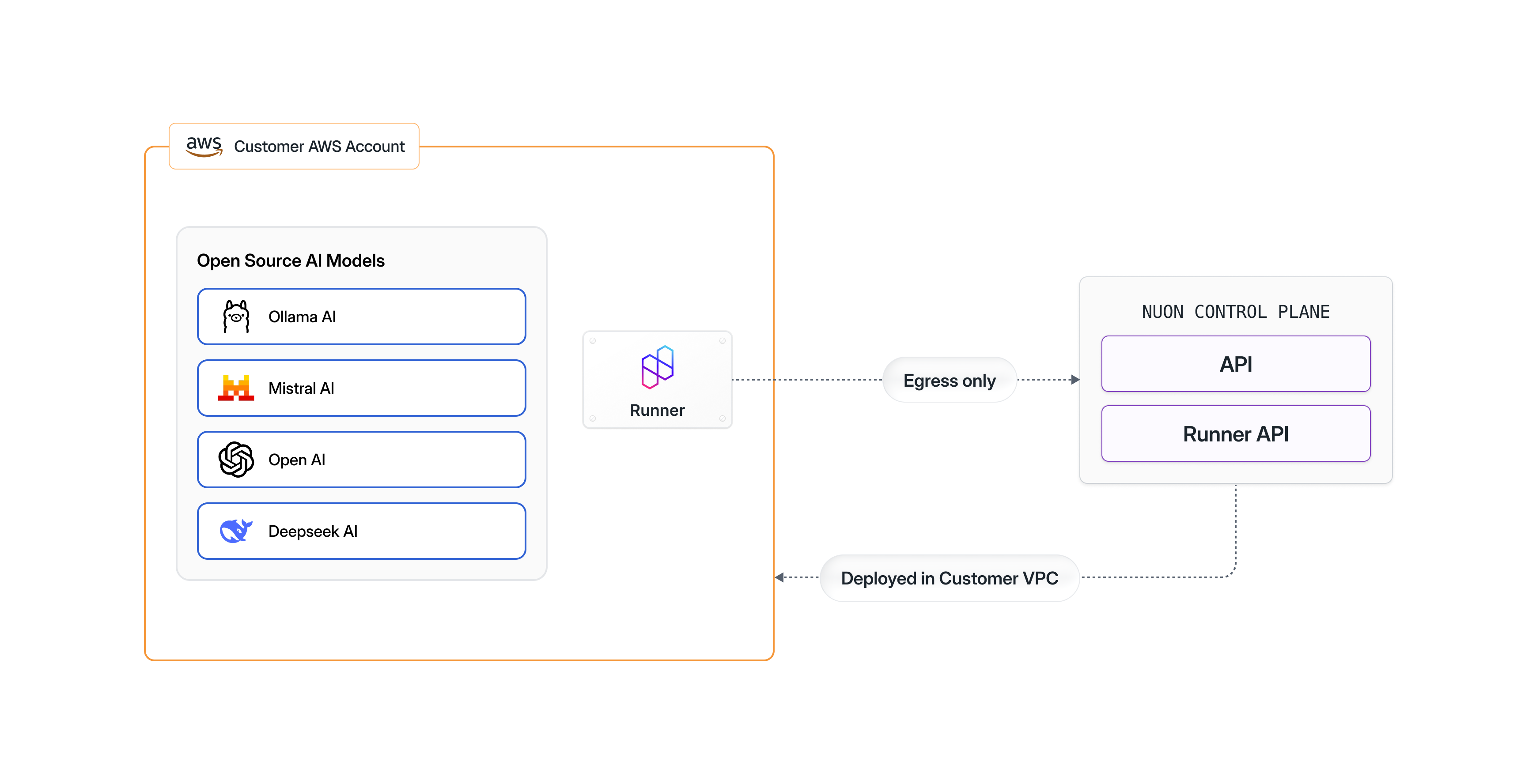 Host open-source models (Llama, Mistral) alongside AI applications in customer accounts. Co-locate with AWS Bedrock, Azure OpenAI, or private model infrastructure—all within one secure environment.
