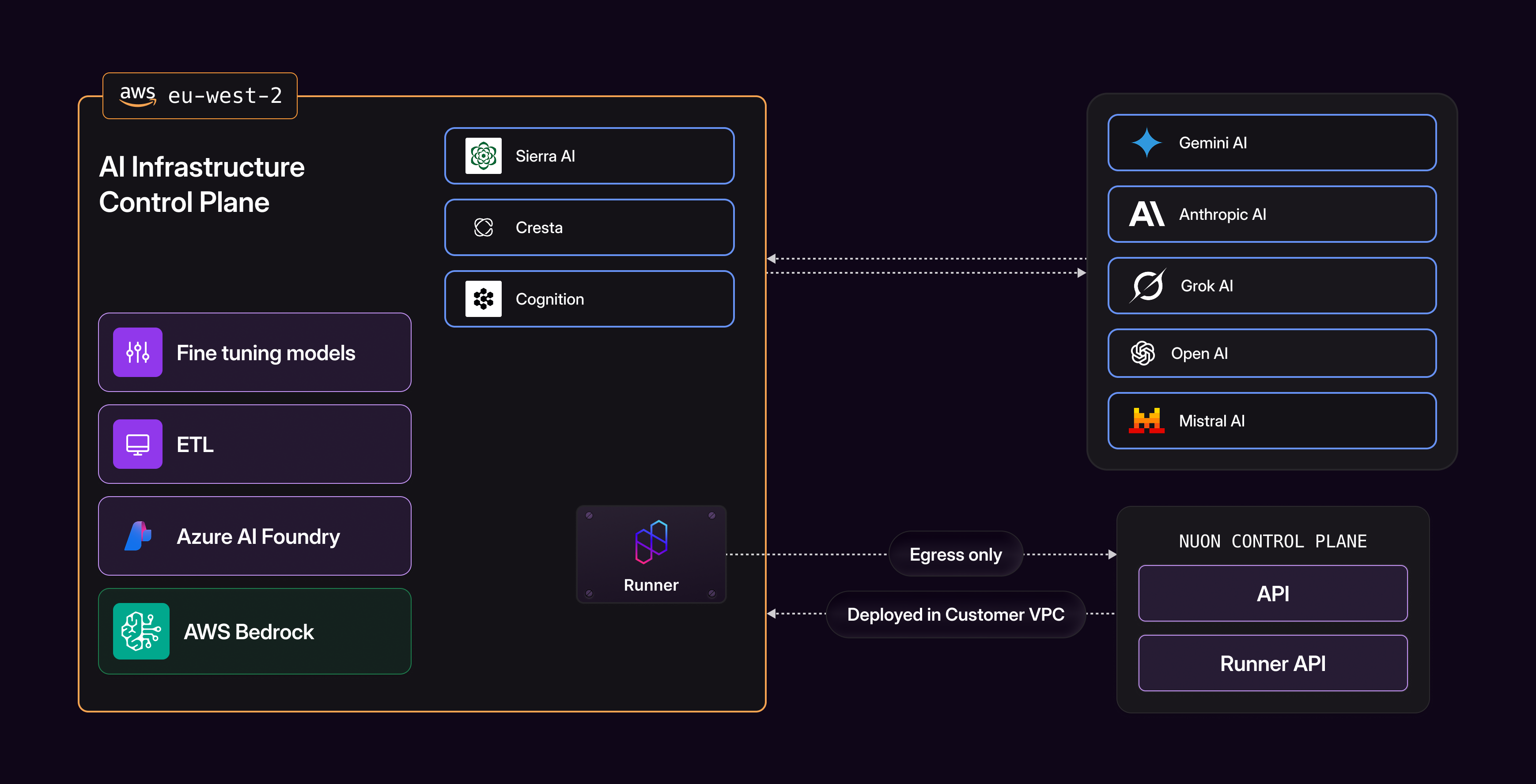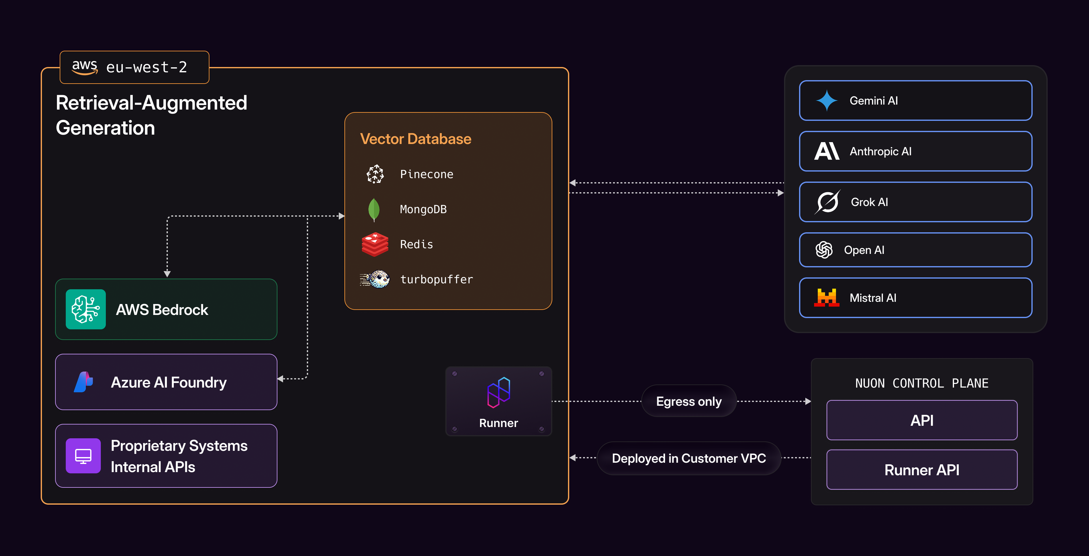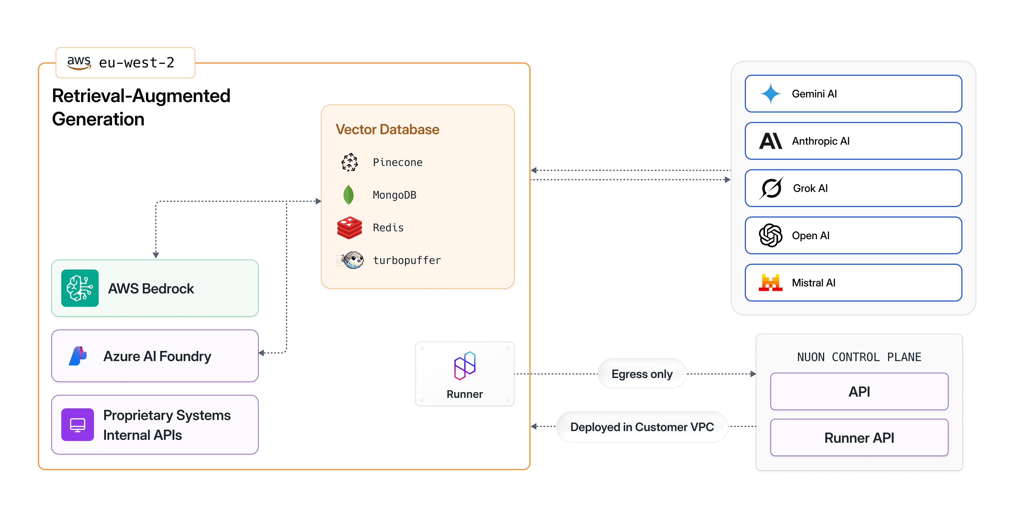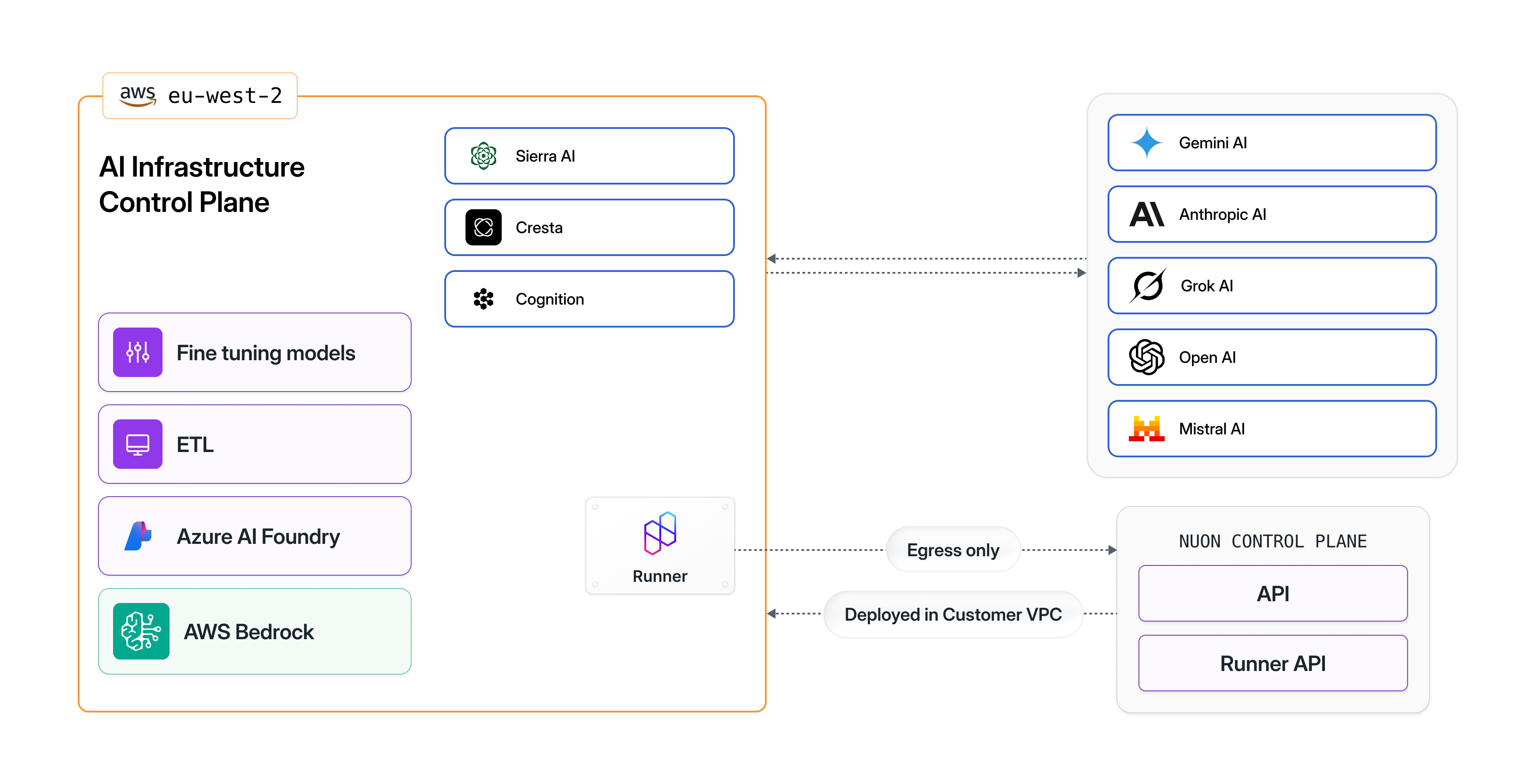 Host open-source models (Llama, Mistral) alongside AI applications in customer accounts. Co-locate with AWS Bedrock, Azure OpenAI, or private model infrastructure—all within one secure environment.