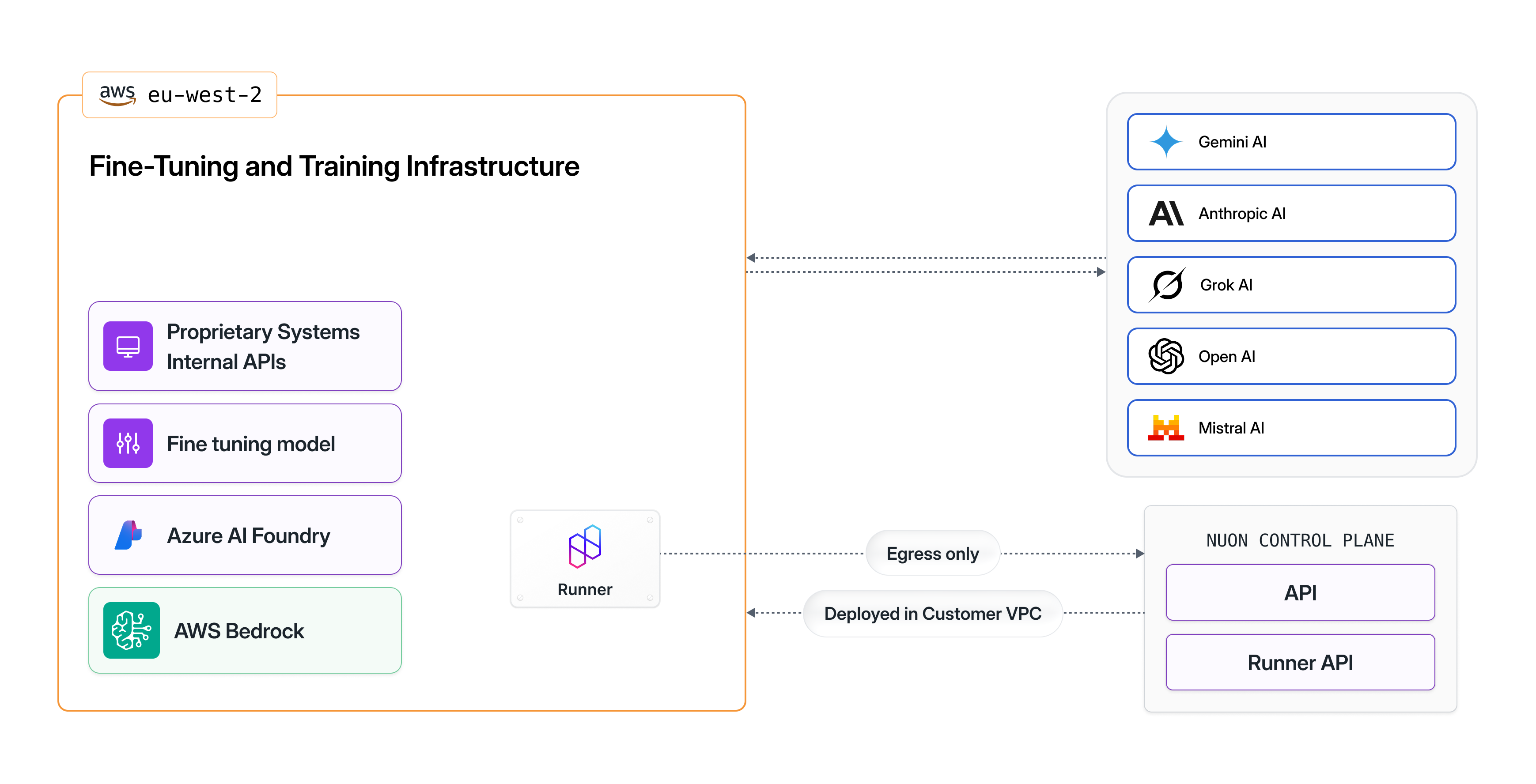 Deploy fine-tuning pipelines in customer clouds where proprietary training data lives. Preprocess sensitive datasets locally before sending to AI provider APIs, meeting compliance requirements.