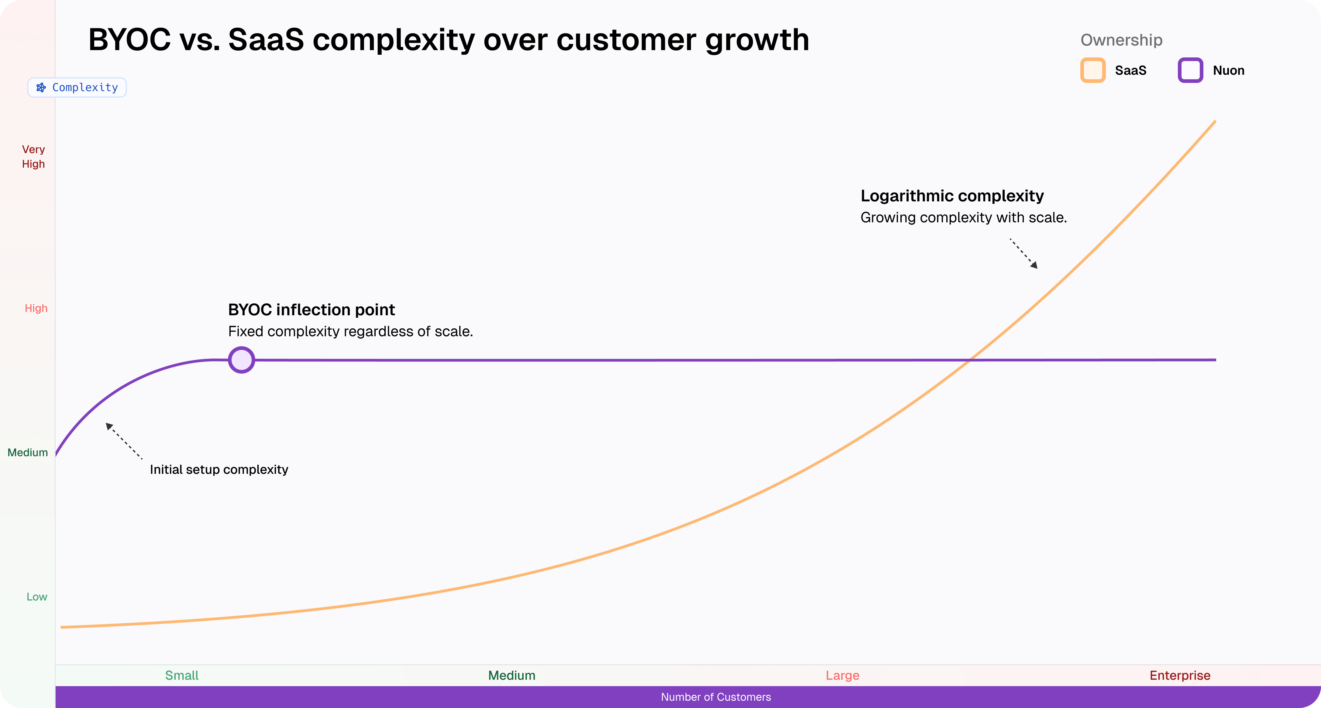 When offering BYOC, there is an inflection point that comes after the large upfront cost of productionizing BYOC. Once you have the ability to seamlessly deploy, maintain, and update your application on user infrastructure, you can quickly scale up from there.
