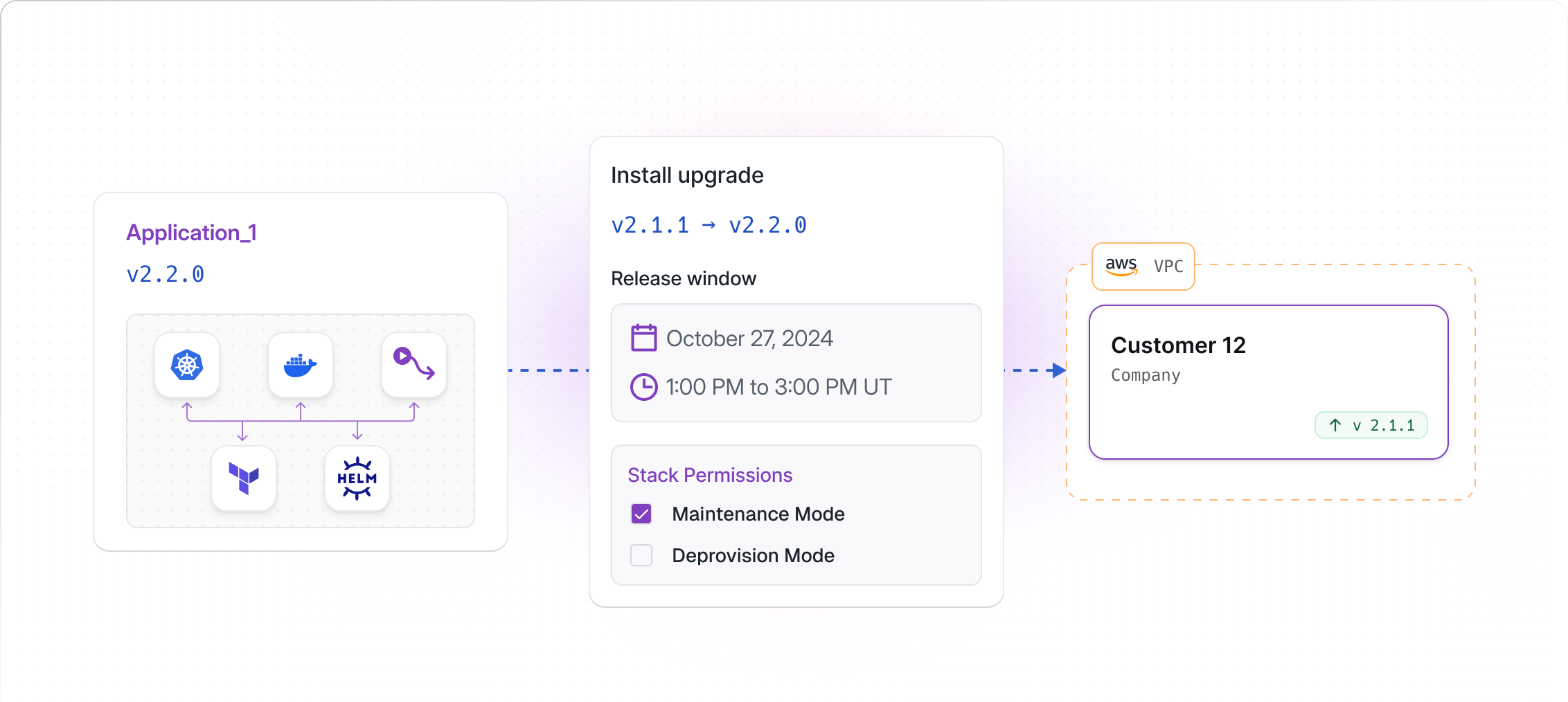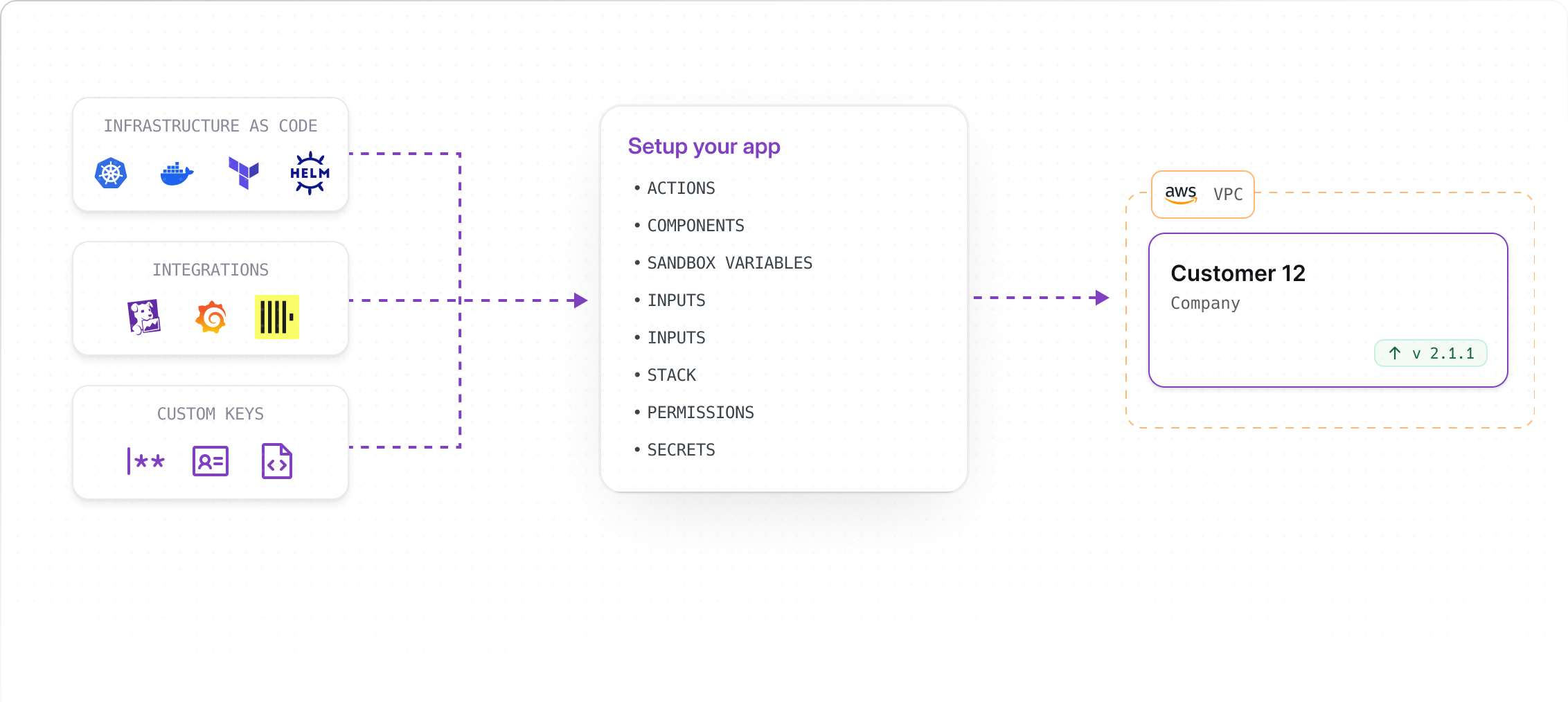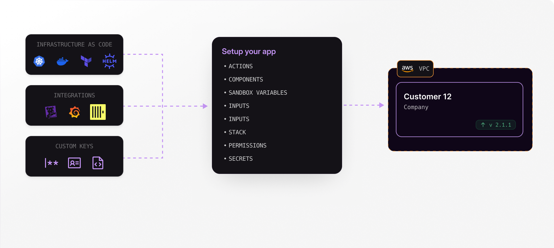 Nuon syncs container images, deploys your Infrastructure as Code, and runs setup actions automatically. Every installation follows provides workflows that include component outputs, detects drifts and checks the overall install health.