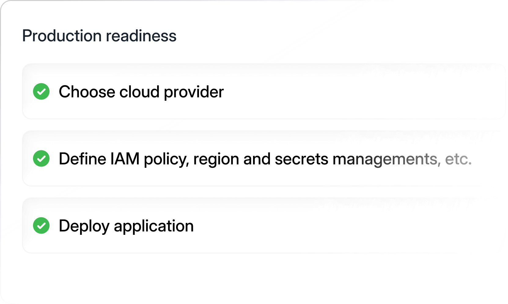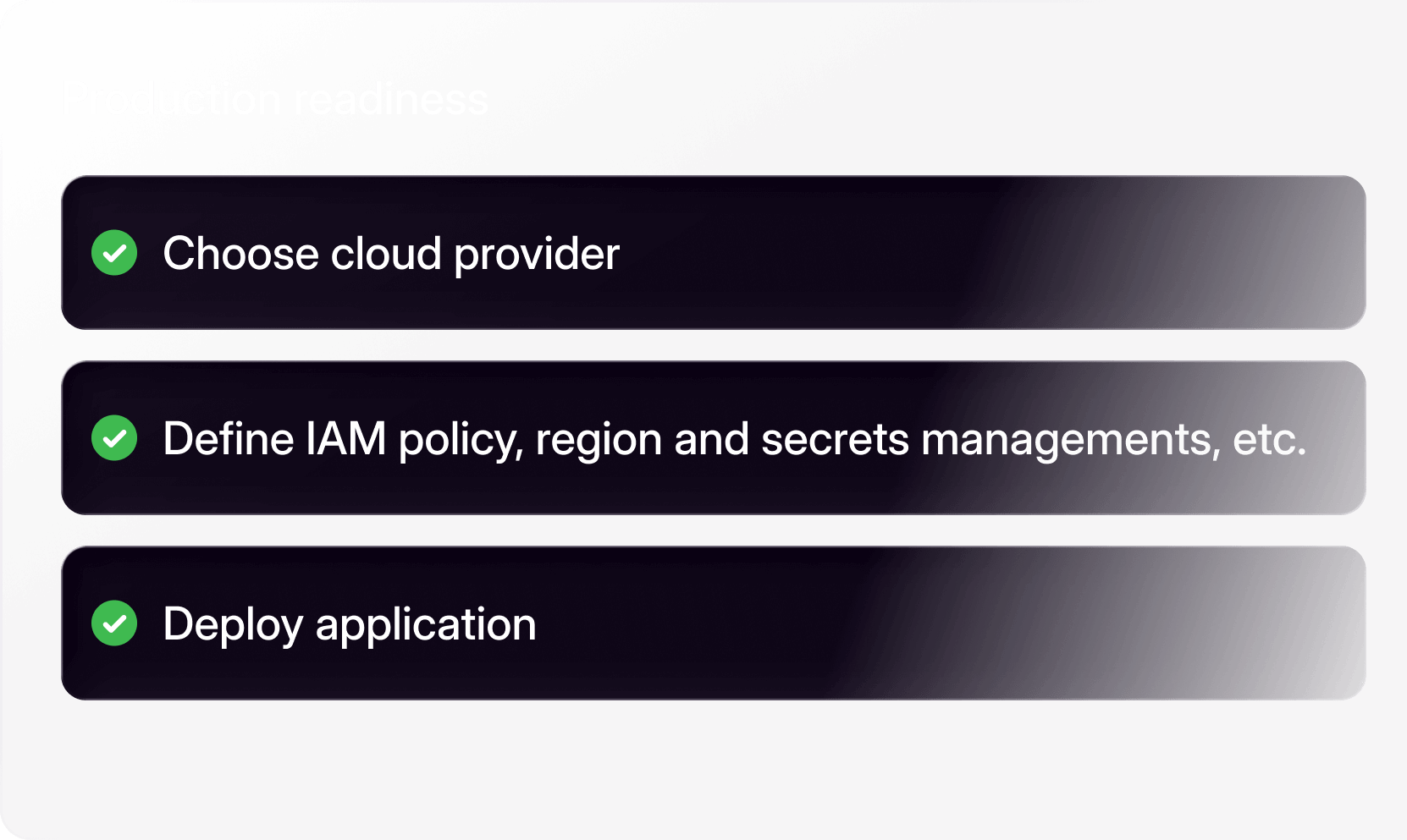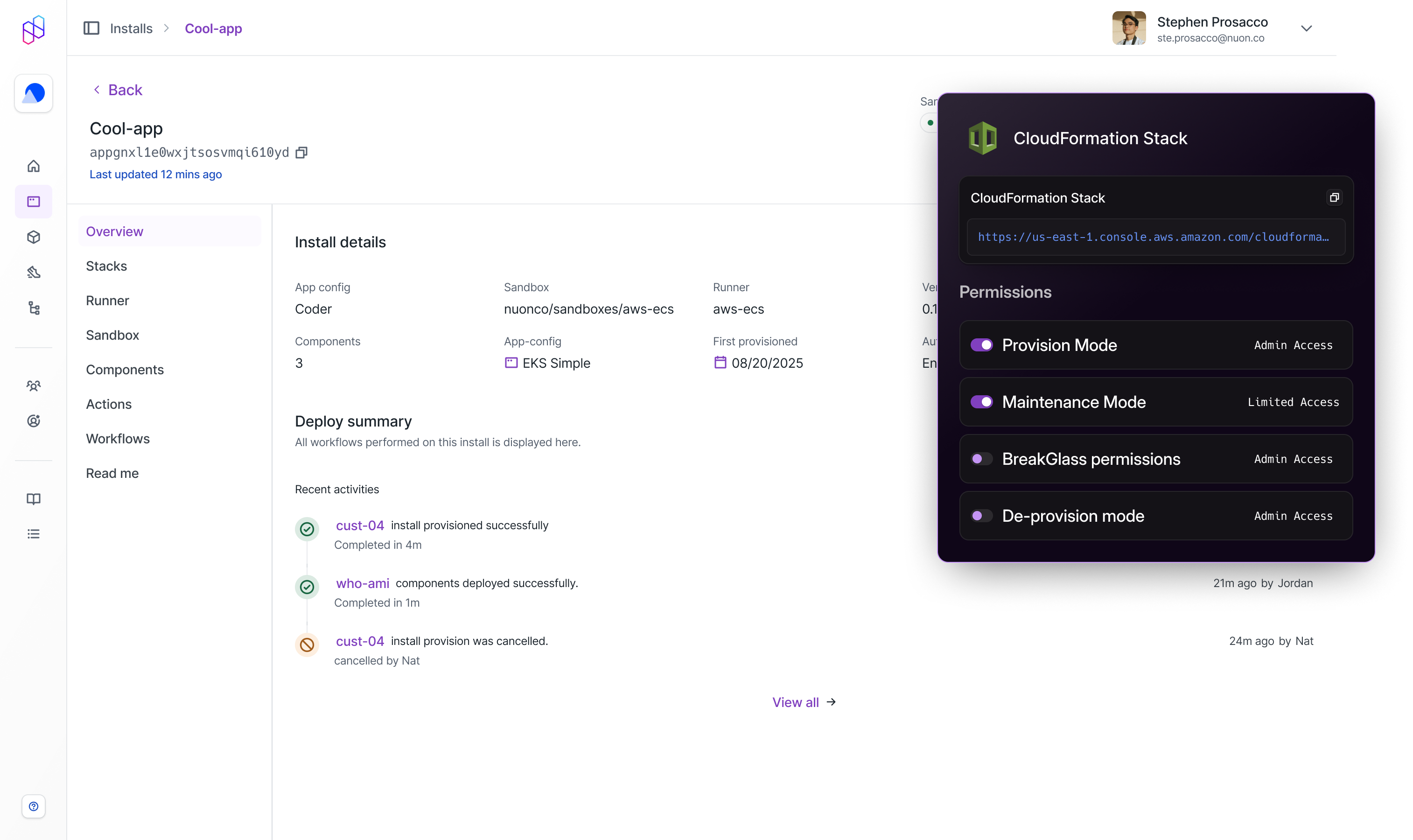 Customers take the generated cloud stack to create a runner that deploys the app into their cloud account with permission boundaries.