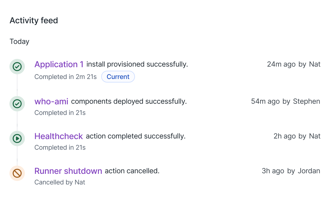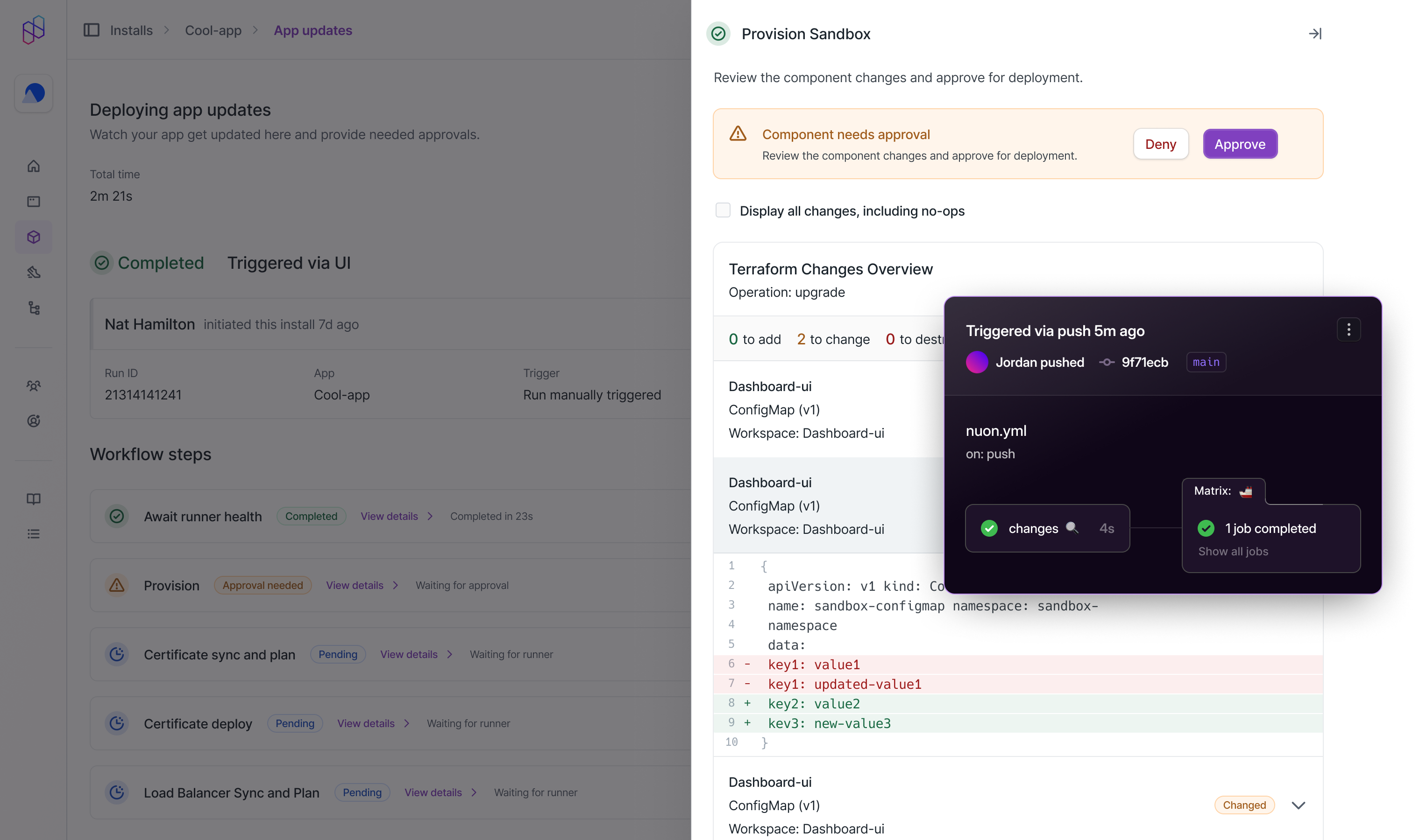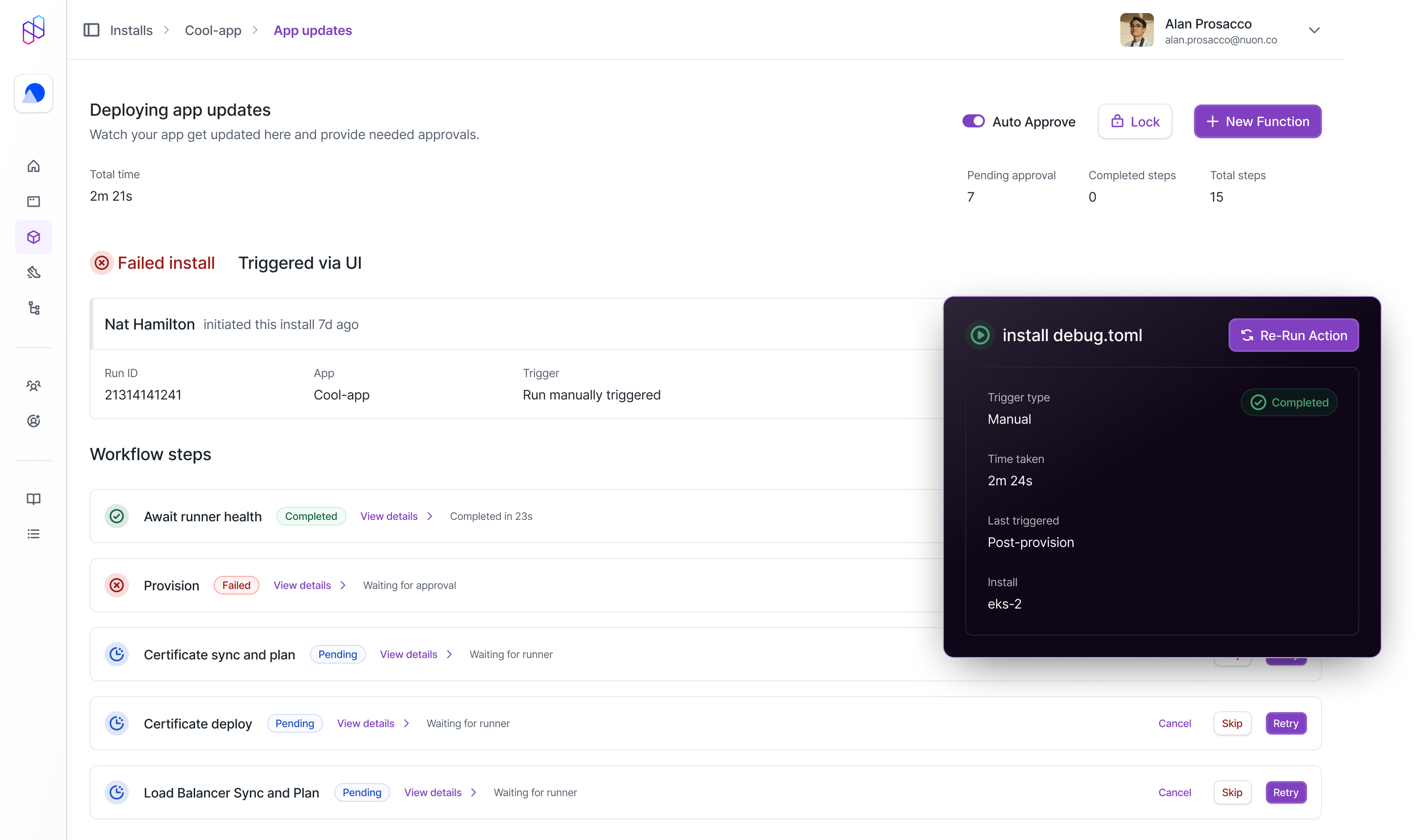 Understand the state of your install, runner activity and approve changes for each app lifecycle activity.