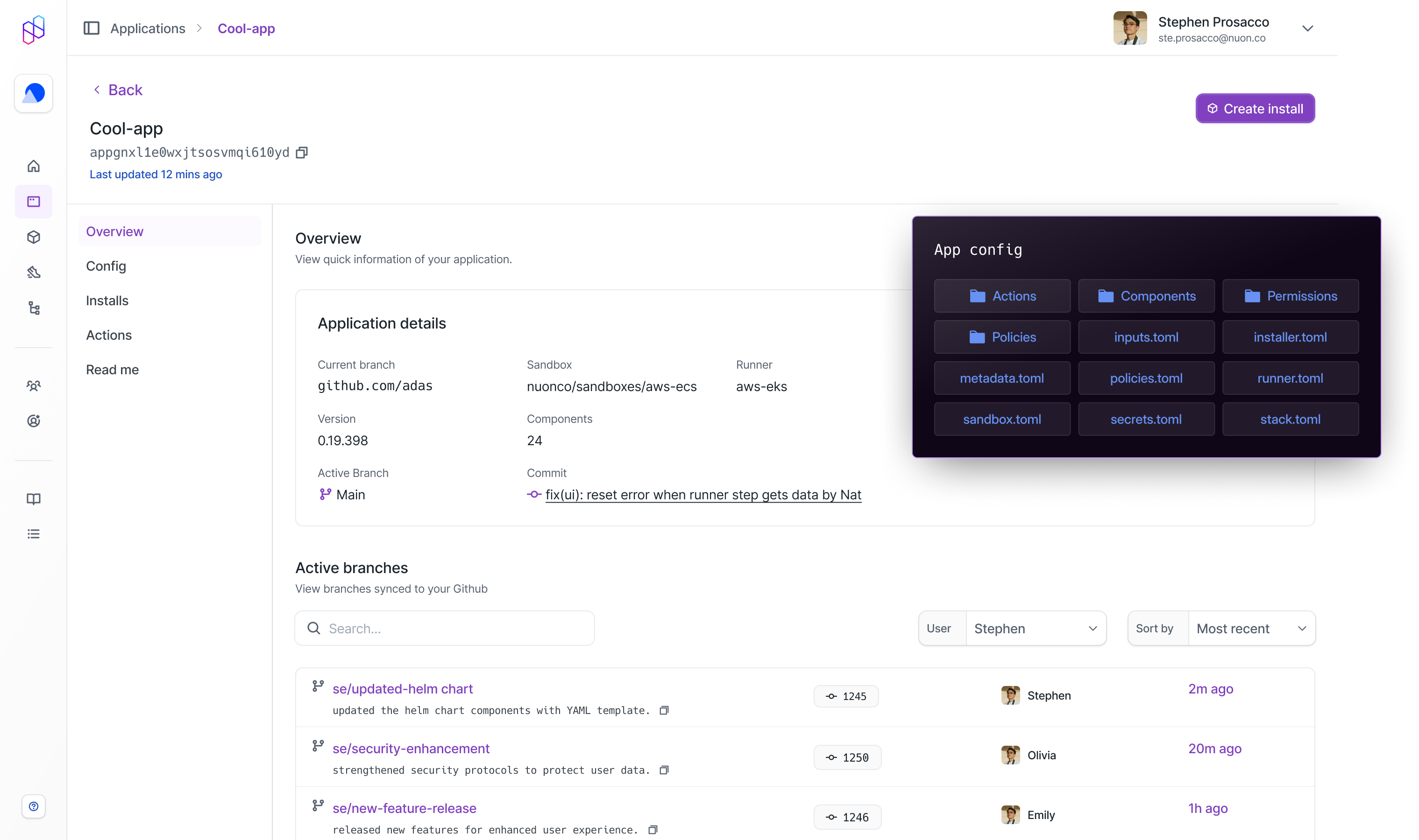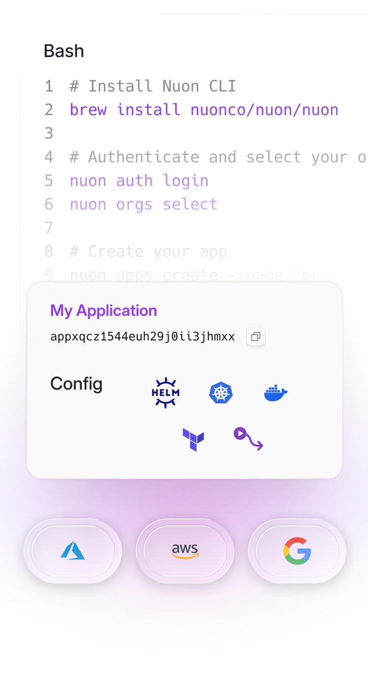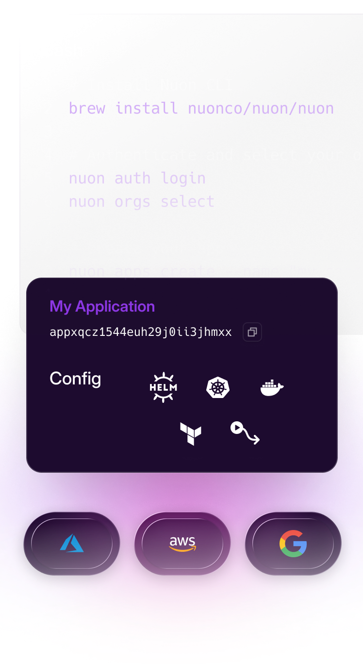 Wrap your Helm charts, Terraform modules, Kubernetes manifests and container images into a Nuon App Config and sync with the CLI.