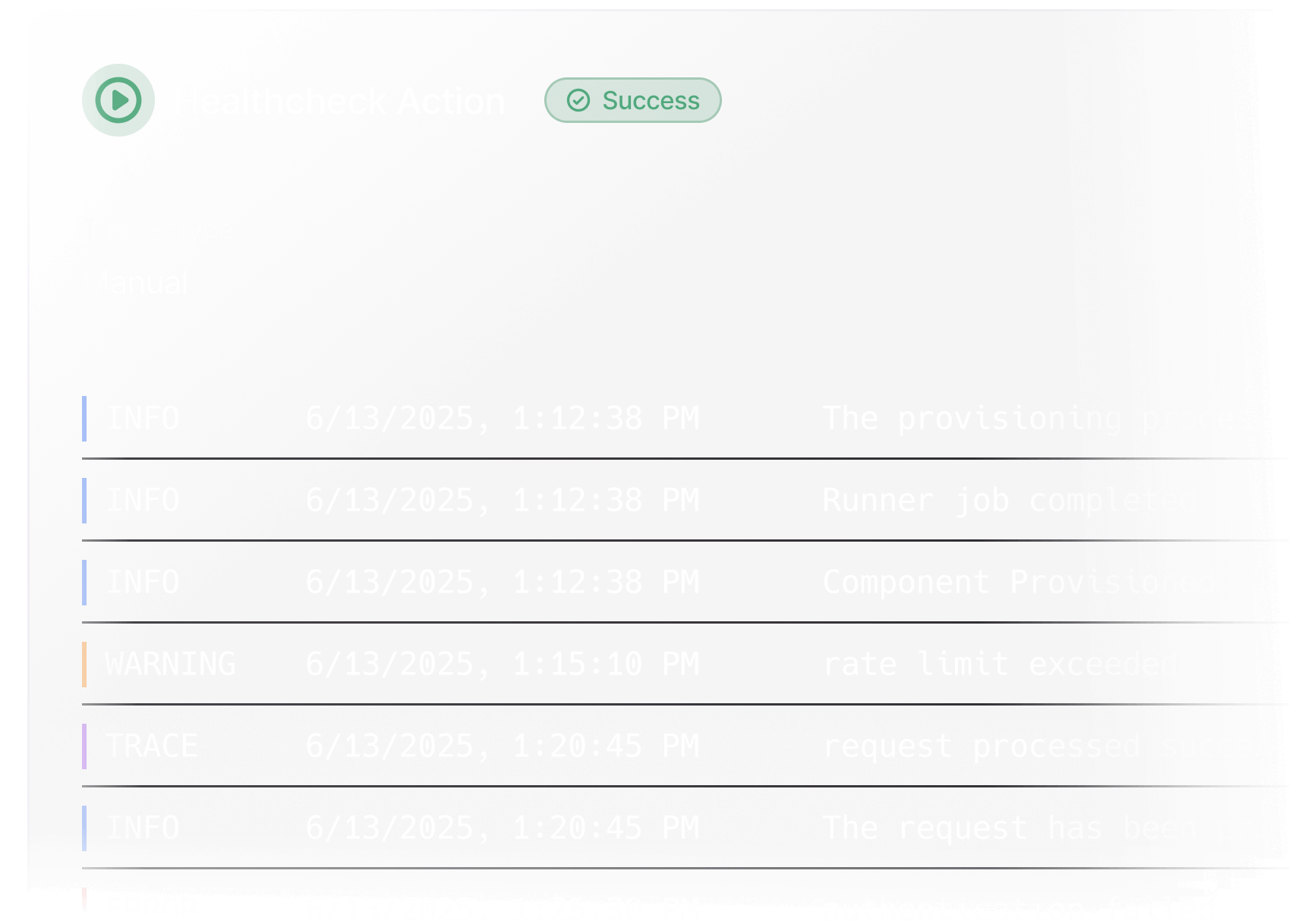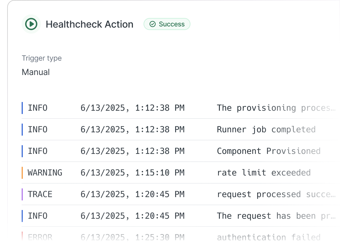 Initialize databases, perform health checks, and more with Actions - custom scripts that are executed by the Nuon runner in the customer cloud.